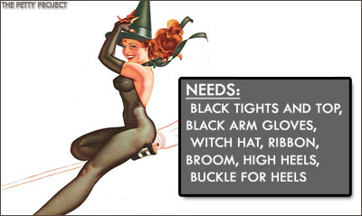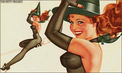 The first stage of the Petty shoot starts where the model and myself sit down and figure out what poses she would like to do from the Petty artwork archive. Normally, a couple of shots are chosen based on what the model might already have as far as clothing items or based on items that can easily be found. For this behind the scenes, the model was the beautiful Kayla and she picked out (among others) the famous Esquire Calendar artwork Petty had done in the 1950s of the Petty Girl in a witch outfit. |
