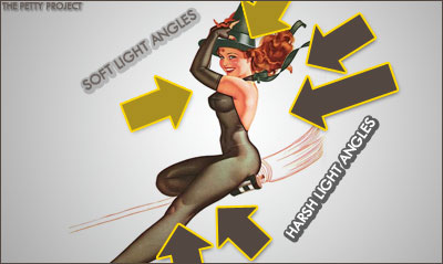 Airbrush shading, I’ve come to find, is near impossible to replicate easily in a studio setting. It’s a piece of art, of course, so the light naturally is altered to match what the artist needs in the piece. Therefore, the lighting that falls on the subject is many times unrealistic in a real life situation, even if you don’t see it with your eye looking at the piece. For this shot, there was a lot of what I call ‘edge darkening’ where the light falls off on the edges of the Petty gal’s body. It’s almost like a slightly straight on and to the high right single light, but on other parts of her body it looks like it’s from a different direction. Not to mention I needed to get an almost shine effect on the now full body leotard. This almost automatically gives the image an painted look. But I’m going for airbrushed, not painted! The effect was achieved with the use of dodging and burning in Photoshop, a type of under and overexposing that dates back to the original days of film photography in a darkroom. Doing this to Kayla gives her leotard a nice sheen look and helps to accent her curves, something that also worked for the Petty Girls. |