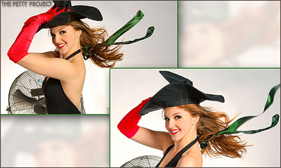 We discovered that it was near impossible to get the wind machines to blow her hair in the way I wanted while she was in the full pose. Problem was that the way Kayla has to hold the witch hat wasn’t enough for it to stay on with the wind machines cranked up to max power. So we decided to shoot her without the wind machines to get the overall pose and body shots done, then just do some wind machine shots of her hair that I’d digitally add in later. We had to take a few different shots and move the wind machines around quite a bit in order to get the correct flow of the hair to match Petty’s witch. All in all, it would eventually take three shots combined of her hair to get the look I was going for mostly because her hair was unpredictable with the wind machines. Below you can see two of the original shots of her hair that were used in combination along with another shot to get the final hair look. |