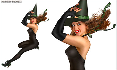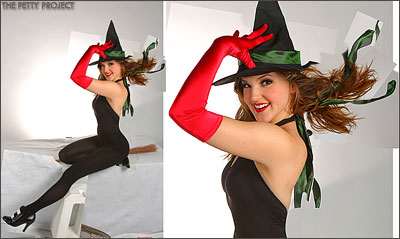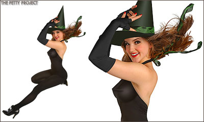 Sometimes, it's just impossible to find the exact outfits or props that are needed. Even with trick photography that can be fixed later on, something needs to be there during the shoot that resembles what the Petty Girl is wearing. In the case of the shoes for the Witch artwork, she's wearing green shoes with a old fashioned oversized buckle. Unfortunately, Halloween was too far away and St Patrick's Day was far off as well when this was shot, so finding green shoes with a buckle was impossible. To solve this problem, Kayla created her own make-shift shoes with buckles using shoes she already had that were close to artwork. Turning them green would be down in Photoshop later on. |