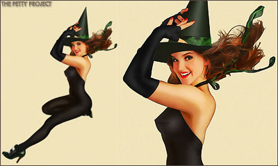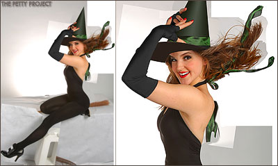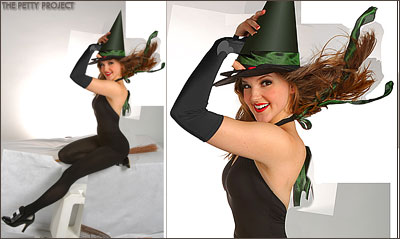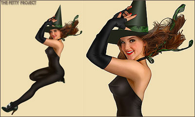 Now that the poses have been picked, it's time time to start planning for the shoot. First up, and most difficult, is tracking down clothing and props for the various shots. Some can be pretty easy and require little to no props (or clothing at times), but many have specifically style outfits from the 40s and 50s. Most of them can be 'faked' or modified in Photoshop later on during post processing, so often times the most simplest of items are used in place of elaborate outfits if the item looks close enough. The concept for this Petty work is pretty simple overall, with blackish green full body tights, a witch hat, green heeled shoes with a large buckle, green ribbon, and gloves. A bit of wind blown hair and a classic smile finishes the ensemble, with a drawn in broom for her to ride on. |